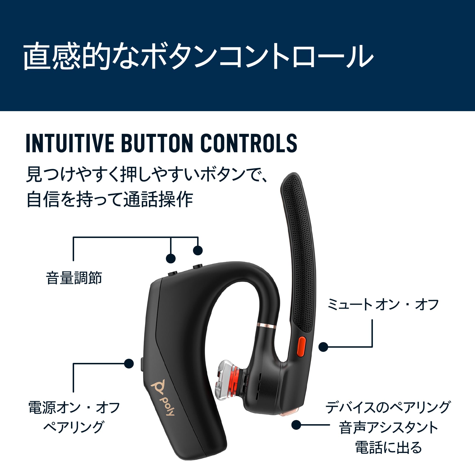 直感的かつ簡単に操作可能な物理ボタンを採用。装着で応答、脱着でミュートなど利便性に優れた設計