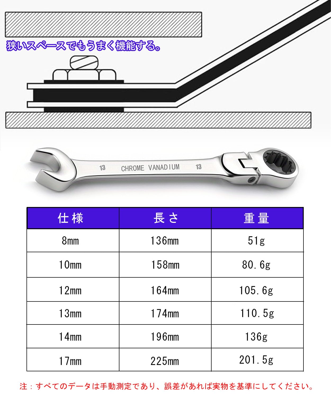 【自由な角度調整】独特の首振りデザインにより、レンチのヘッドは0~180°の範囲で柔軟に調整できます。これにより狭いスペースの障害物を回避し、十分な握りスペースを確保できます。72歯のデザインと組み合わせることで、ナットをしっかりと掴むことができ、またレンチのヘッドには回転方向を示す矢印があり、使い勝手が向上します。