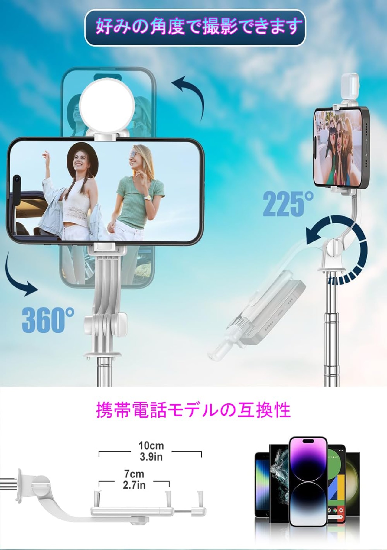 【7段階伸縮・LEDライト付じどり棒】範囲が広いため様々な場所で撮影可能。ボール雲台は360度の回転ができ自由に角度を変えれます。しっかりと固定されるので横向きはもちろん縦向きや斜めにと好きな角度に調節できます。充電式3段階LED付き。シーンに合わせて3色の調光ができます。ライトにより美肌効果が生まれるため、自撮りはもちろんライブ、ビデオ撮影でより美しく撮影ができます。注意:固定したスマホの位置は360度自由に回転できますが、自撮り棒の接続部は225度までしか上下できません。