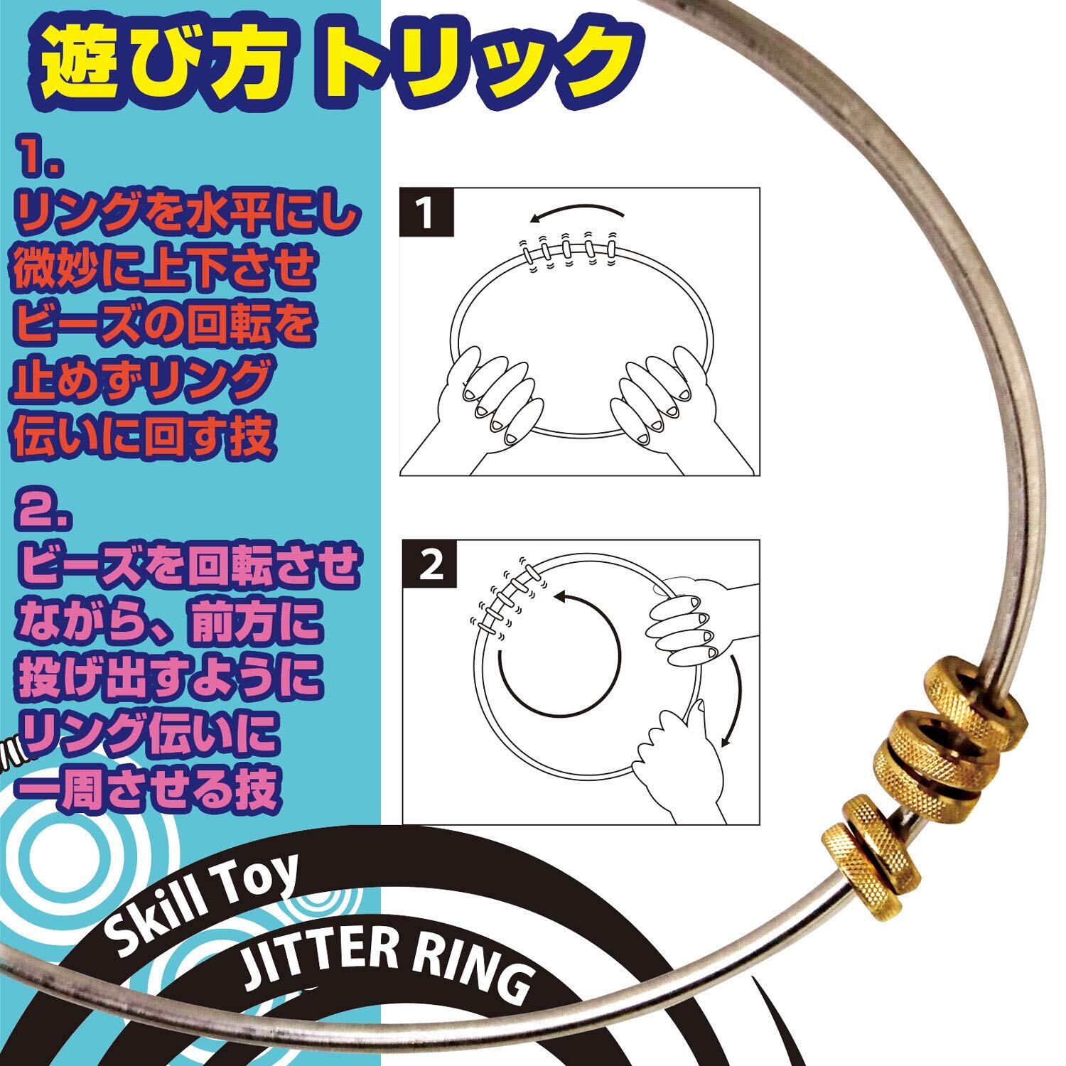 【グッド・トイ賞/選考委員の講評コメント】 大きな金属の輪に小さな輪が5つ通されています。小さな輪を指で回し、その回転が止まらないように大きな輪を回すのが基本的な遊び方。コツをつかむと上手に回せるようになりハマります。手に伝わる振動がまた楽しい。落下のエネルギーや遠心力のエネルギーが小さな輪に伝わると回転が加速することがわかります。科学的思考を育むおもちゃです。 小さな子もくるくる回すだけで楽しめます! 商品仕様3: ジターリングで集中力アップ! 音も振動も心地良くて脳トレにもストレス解消になるスキルトイ