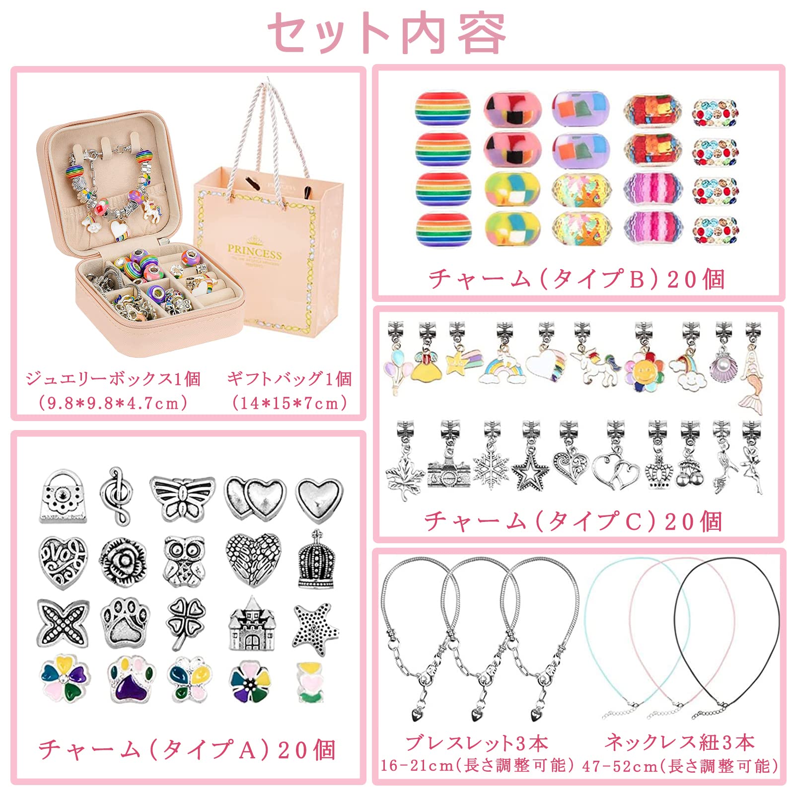 【セット内容】60個様々なかわいいチャームがセットになっている、また基本的なブレスレット3本、ネックレス紐3本が付属、女の子が喜ぶようなアクセサリーが簡単に作れるおもちゃです!おしゃれを持ち始めた子どもに向けています。6歳以上