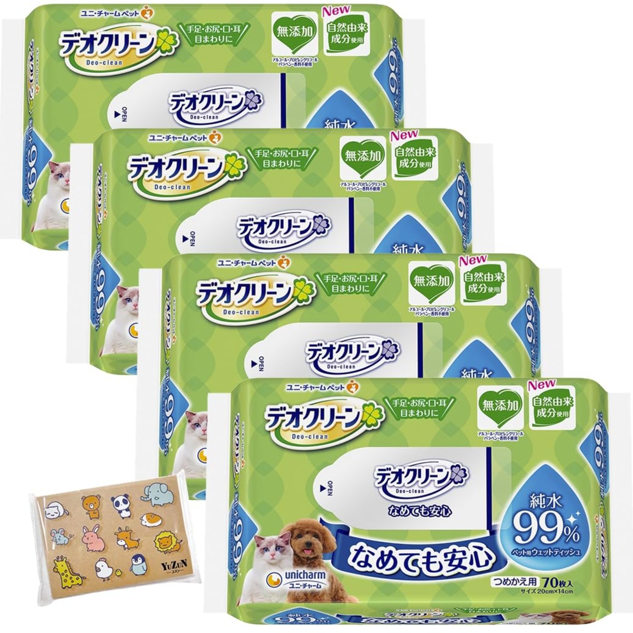 【4個セット】 デオクリーン 純水99%ウェットティッシュ 詰め替え用(70枚入) 犬猫兼用 YuZuNポケットティッシュ付き なめても安心 つめかえ用