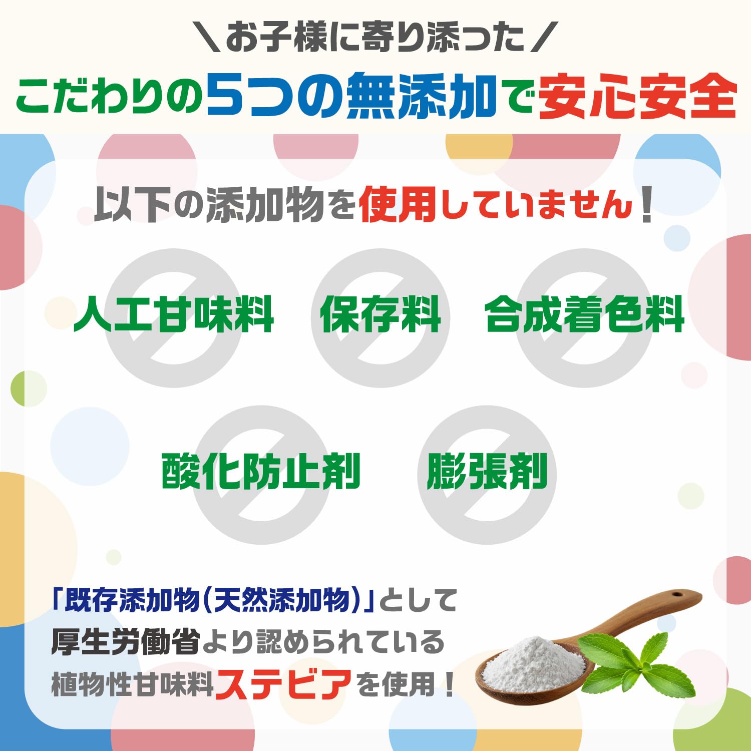 【人工甘味料不使用】甘味料には植物性のステビアとオリゴ糖を使用。人工甘味料不使用なので子供が毎日飲んでも安心です!合成着色料・合成保存料・増粘剤も無添加で、オーガニック・ナチュラル志向の方におすすめ。