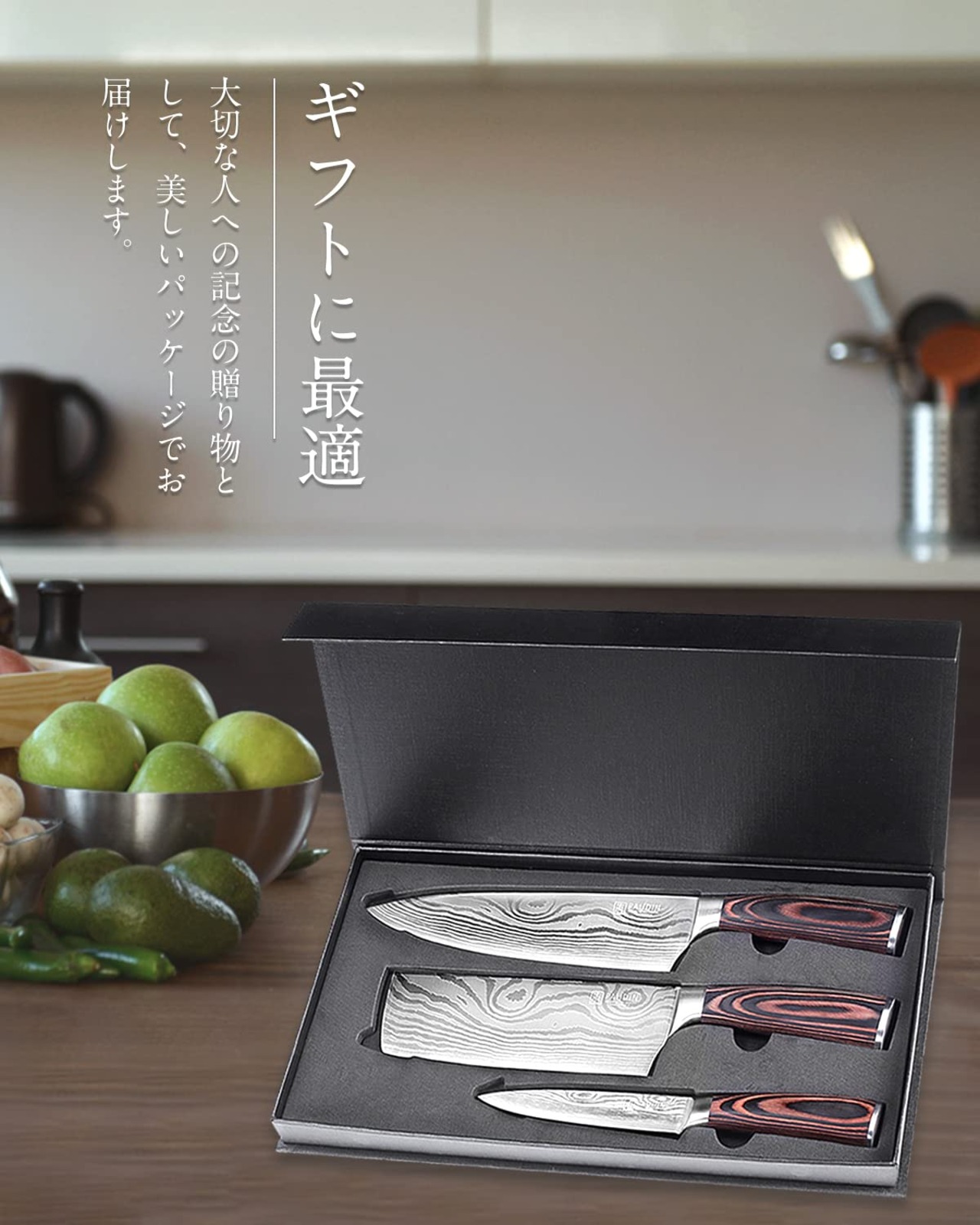 【多機能 包丁セット】 この3点包丁セットは肉・野菜・果物などに使える万能包丁です。表面にレーザー加工したダマスカス包丁のような模様は、装飾性と実用性を兼ね備えて、大切な人への贈り物にも適しています。ご家庭用に最適なキッチンナイフです。●サイズ: 【牛刀】 刃渡り:200mm、全長:340mm、刃厚:2mm、重さ:196g。【ペティナイフ】 刃渡り:127mm、全長:235mm、刃厚:1.5mm、重さ:80g。【菜切り包丁】 刃渡り:165mm、全長:305mm、刃厚:2mm、重さ:225g。