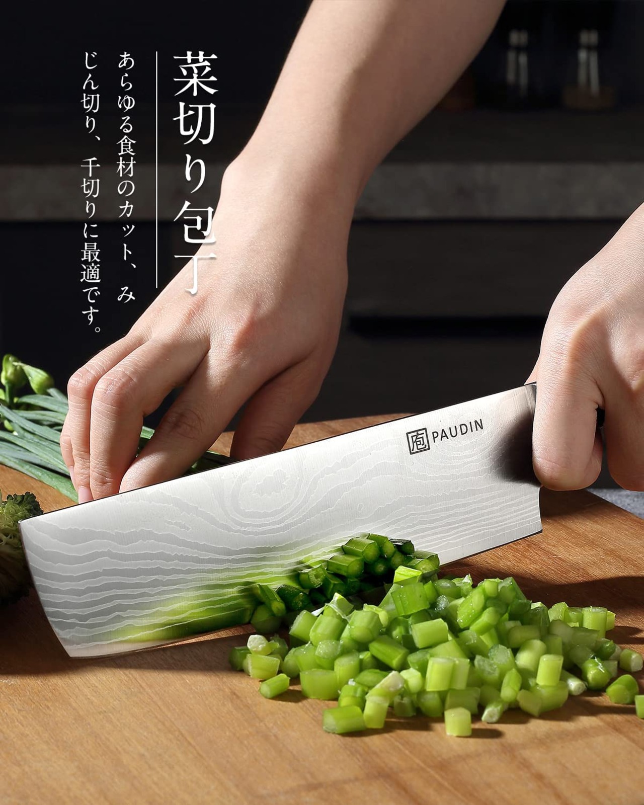 【菜切り包丁】 菜刀は5Cr15Movという高炭素ステンレス鋼で作られ、国際先端な精鋼技術で鍛造を繰り返し、錆びにくく、長くお使っていただけます。さらに靭性、耐衝撃性、耐久性を大幅に強化します。刃は細かく研磨されており、抜群の切れ味で、肉、野菜、果物などあらゆるものを簡単に切り分ける薄刃包丁です。