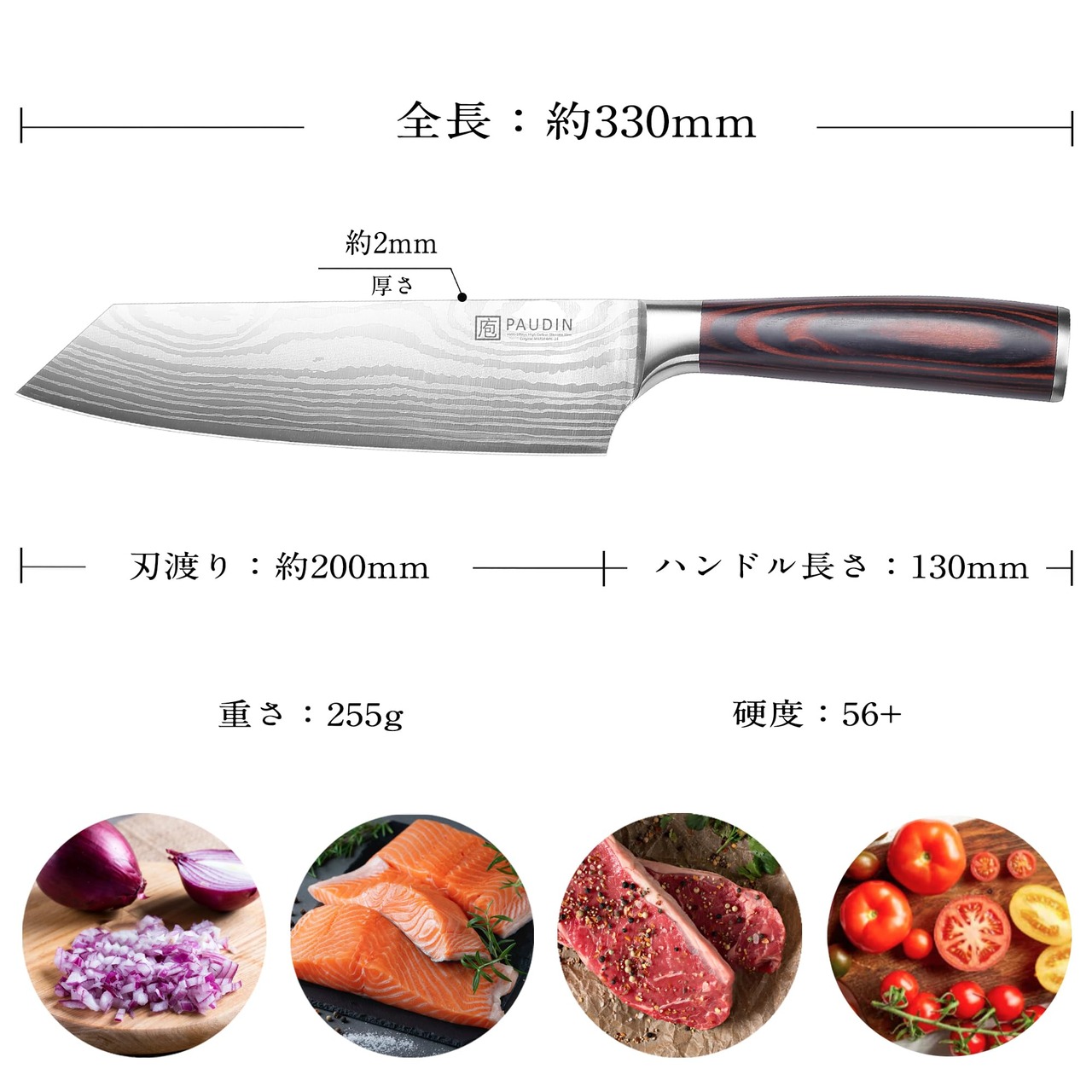 PAUDIN 三徳包丁 剣型 200mm 255g 5Cr15Mov 高炭素ステンレス 万能包丁 木製ハンドル 切りやすい 両刃包丁 左利き対応 鞘付き 肉切り· 魚切り·菜切り包丁 キッチン用品 ギフト 贈り物