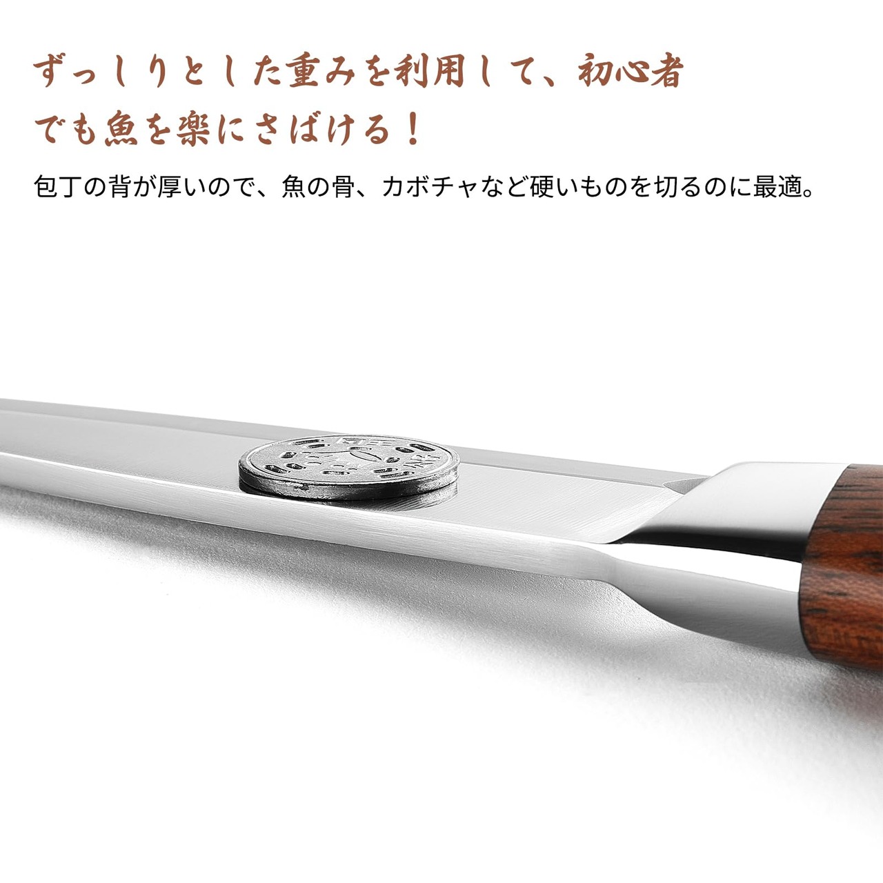 【鋭い切れ味】高炭素ドイツ1.4116ステンレスを採用しており、錆に強く、切れ味、耐用性、耐摩耗性が優れています。精鋼技術で作られているため、刃が硬く、磨耗しにくいのが特徴です。他の鋼より強く切れ味が長持ちします。ずっしりした重量感があり、重みを利用して魚や肉をさばくのに適した出刃包丁です。すり傷防止のために刃の表面はマット仕上げしております。研ぎなどメンテナンスをしっかり行えば、長年お使いいただけます。