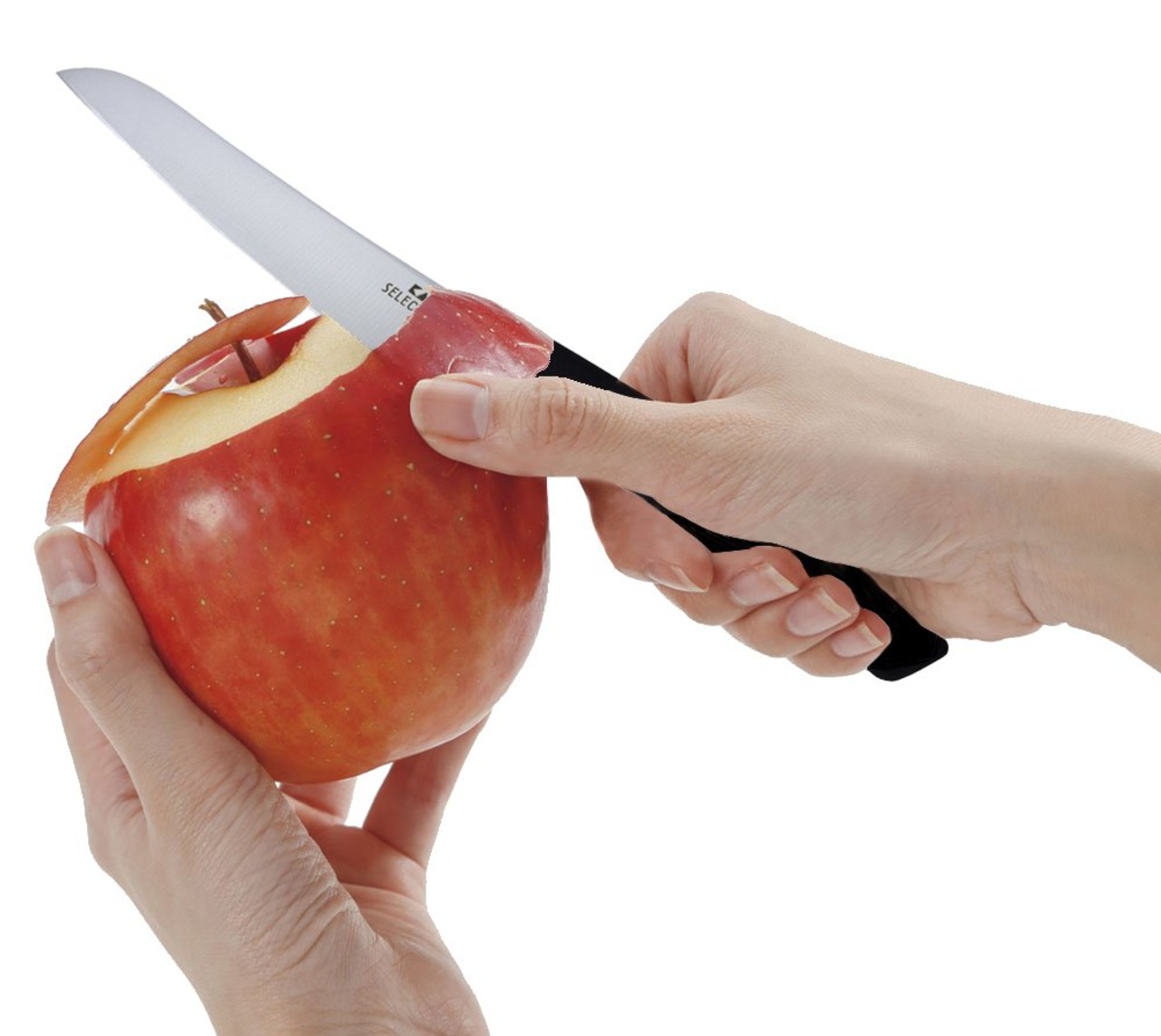 果物の皮を剥く刃の向きと握りやすい柄の角度を追求しました。ステンレス刃物鋼に本格刃付けをしているので、包丁と同じように研ぎ直しも出来ます。りんごが簡単に二つ割りにできる120mmの刃渡りです。