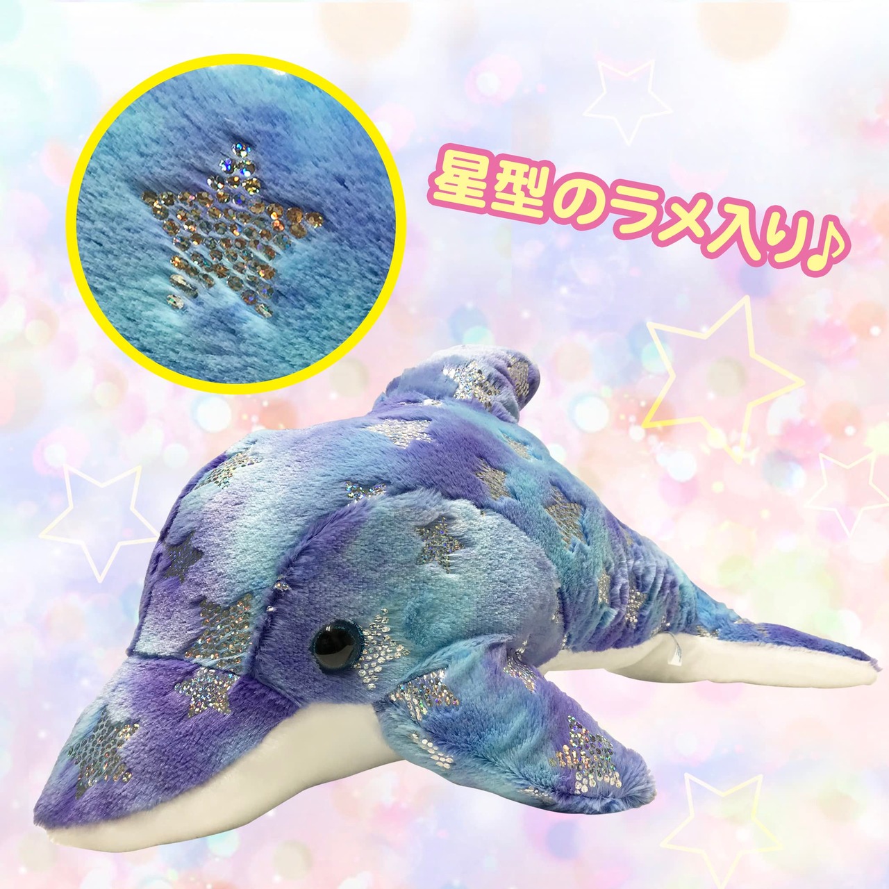【キラキラ・かわいいイルカのぬいぐるみ】ふわっとしてもっちりとした海の人気者イルカ。1度手にするとクセになるくらいたまらなく気持ちいいマスコットです。一緒にスヤスヤ眠りたくなる癒しのアイテム。またキラキラ星型ラメの付いた今、流行のオーロラ柄のぬいぐるみです。