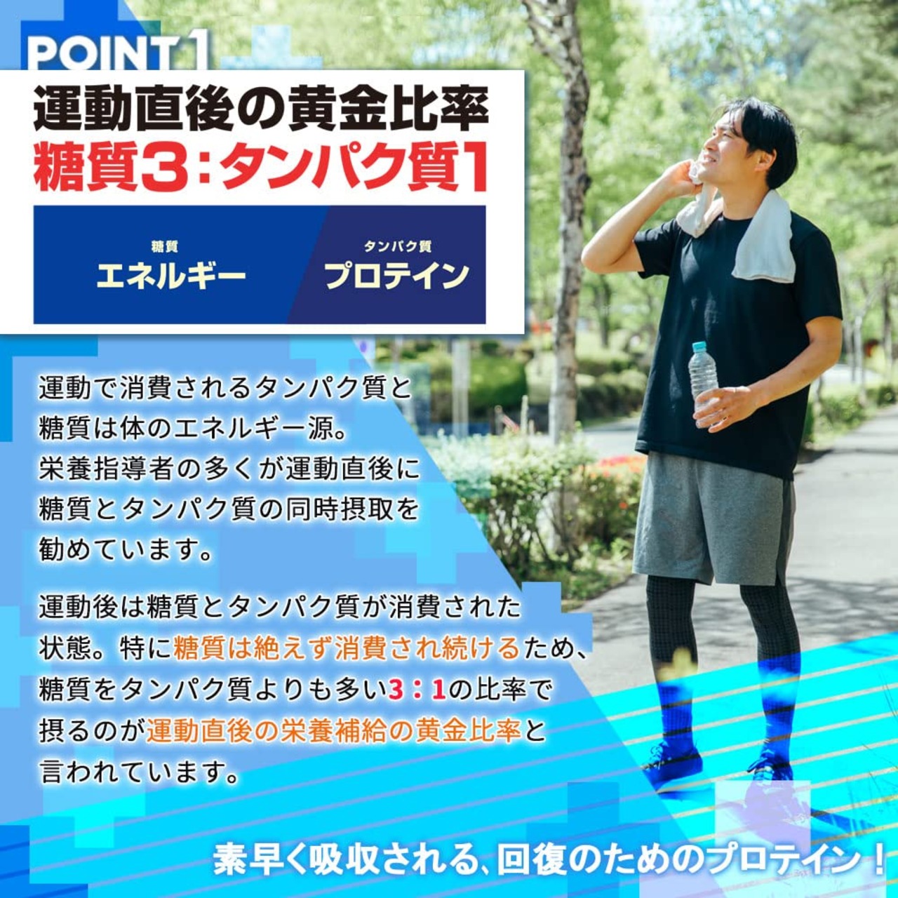 特徴: 【素早い回復のために】 スポーツ、エクササイズで消費したカラダの「回復」を追求したプロテイン。栄養指導者の多くが支持する黄金比「糖質3:タンパク質1」で配合。水で飲みやすいプロテイン。