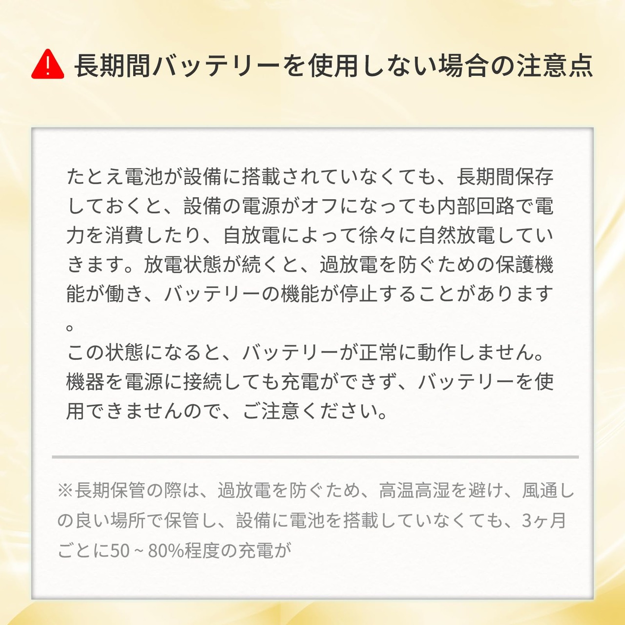 過電流保護・過充放電防止・温度センサー機能付き、残量表示、本体及び純正充電器での充電可能