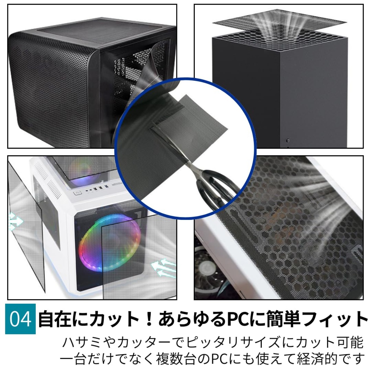 【ホコリを防いでPC長持ち】大切なパソコンをホコリから守る高品質ダストフィルター。PCケースのスリットパネル部分に取り付けることで、ホコリがパソコンケース内部に侵入するのを防ぎます。メッシュフィルターで通気性を確保しながら、微細なホコリもしっかりブロック。PC内部の清掃頻度を劇的にダウン。ファンやその他精密機器への負荷を軽減し、PCの寿命を延ばします。面倒な掃除の手間を省き、より快適なPCライフを送りませんか?