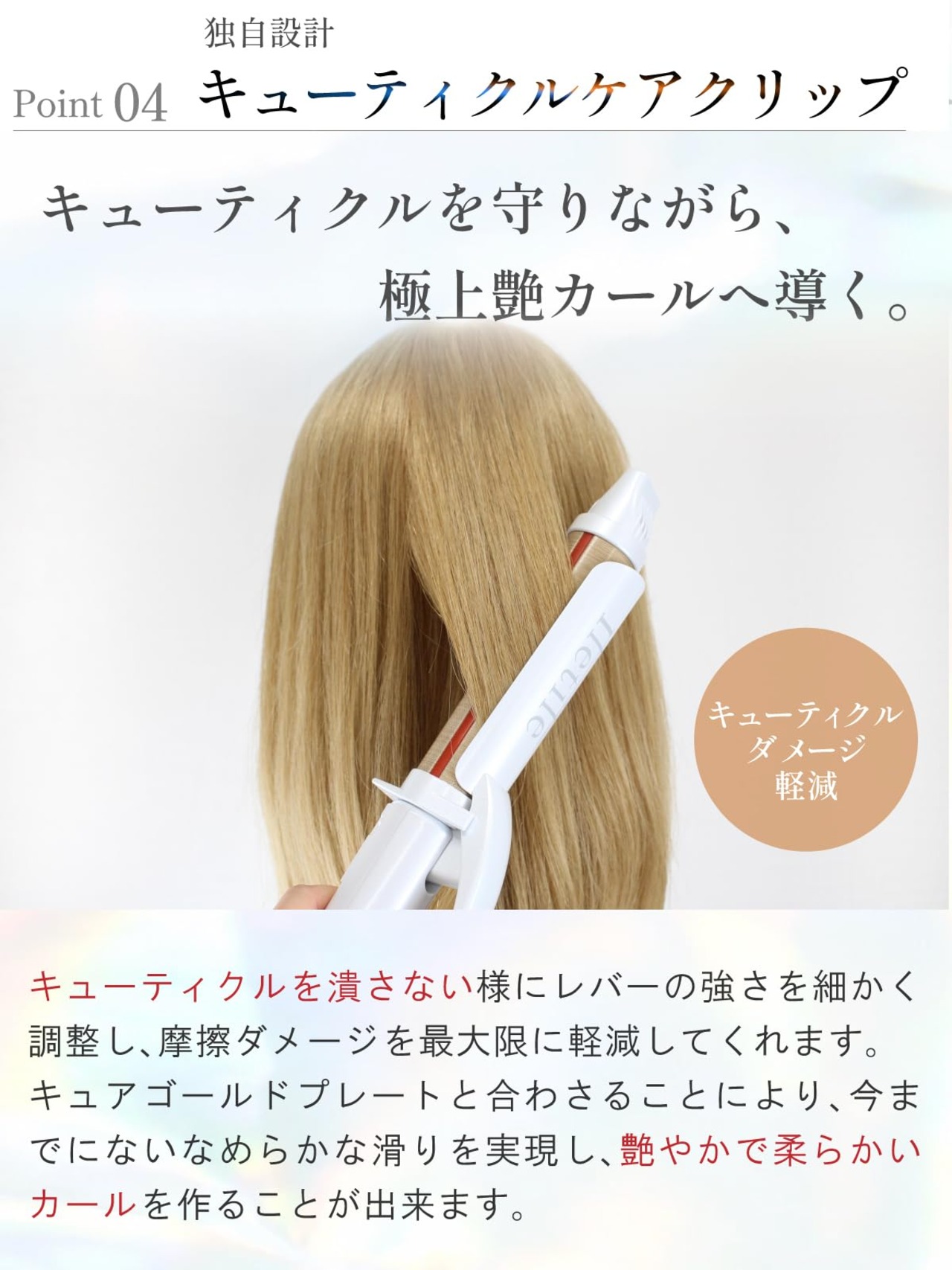 【こだわりのハイスペック】キューティクルを潰さないキューティクルケアクリップ。カールが簡単幅広クリップ。誤作動防止温度ロック機能。12段階温度設定、温度記憶、オートOFF機能搭載。360度回転コード。海外対応。