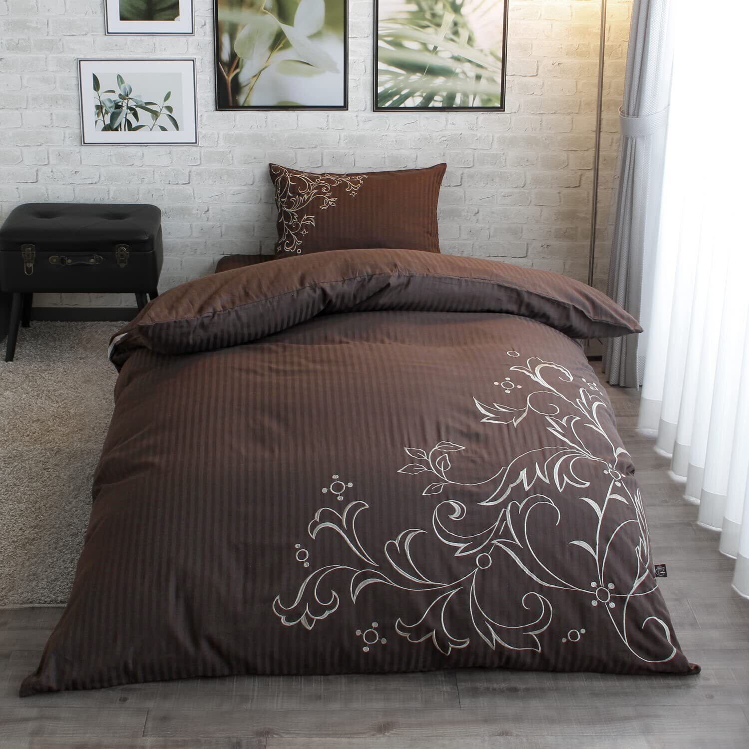 サテンストライプに刺繍を施し、上品で繊細なイメージの掛布団カバー。高密度な刺繍には光沢があり高級感を演出。サテンストライプの特長でもある上品な光沢感と滑らかな肌触りがラグジュアリー感のあるベッドルームを演出。綿100%の生地を使用し保湿性、吸水性に優れている為 オールシーズン快適にお使いいただけます。カバー内部には8カ所スナップボタン付き。布団側のループ通してパチンと留める簡単仕様になっています。深みのあるブラウンカラーはナチュラルで落ち着いたベッドルームに。また 上品な光沢感のあるカバーはゲスト用にもおすすめです。カバーサイズは190×210㎝の掛布団用。(接ぎのつなぎ目が入ります。)洗濯OK。洗濯機使用の場合は洗濯ネットを使用。乾燥機の使用は避けてください。※商品に付いている取扱い表示に従って洗濯して下さい。小栗株式会社は日本の寝具メーカーです。